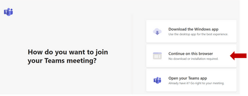 2. Select the option to “Continue on this browser.” It is recommended for attendees to join the webinar through a browser rather than using the Microsoft Teams app. Note: There are no waiting rooms for the webinars, if you encounter a waiting room or if you are not prompted with the following options, try logging out of your Microsoft Teams app before entering through a browser.